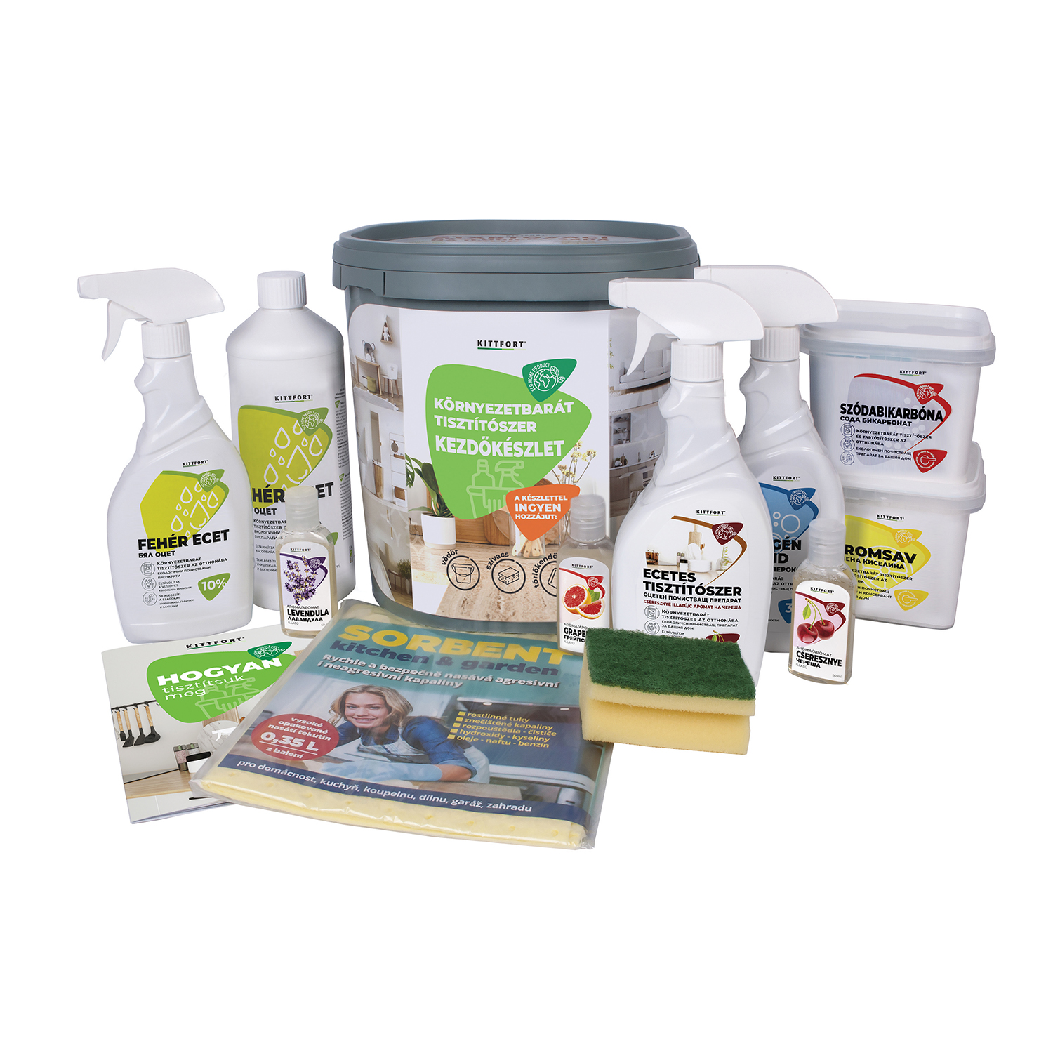 A készlet tartalma: Fehér ecet 10% 1L, Fehér ecet 10% 500ml szórófejes, Hidrogén peroxid 3% 500ml szórófejes, Citromsav 1kg, Szódabikarbóna 1kg, Ecetes tisztítószer cseresznye illatú 500ml szórófejes, Aroma illatosító grépfrút 50ml, Aroma illatosító levelendula 50ml, Aroma illatosító cseresznye 50ml